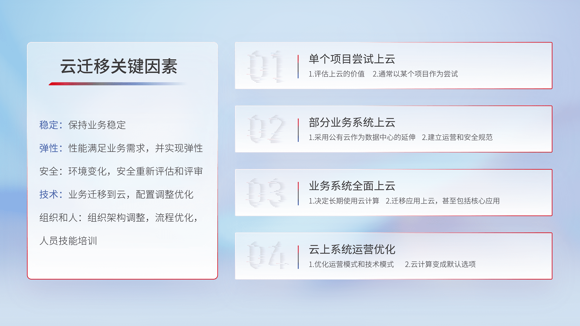结合实际业务,,,,从规划设计、、、、云平台选型、、、、云原生改造、、、数据迁移、、、、集成交付,,,,迁移全过程为客户识别最佳上云路径,,,,做好风险识别管理,,,设计网络架构、、、身份权限、、、、安全审计合规、、、、操作审计、、日志审计、、、监控告警策略、、、、多站点容灾设计等,,,,对云上基础设施进行整体规划,,提升IT治理水平,,,以满足弹性、、高可用、、、高性能的需求。。
